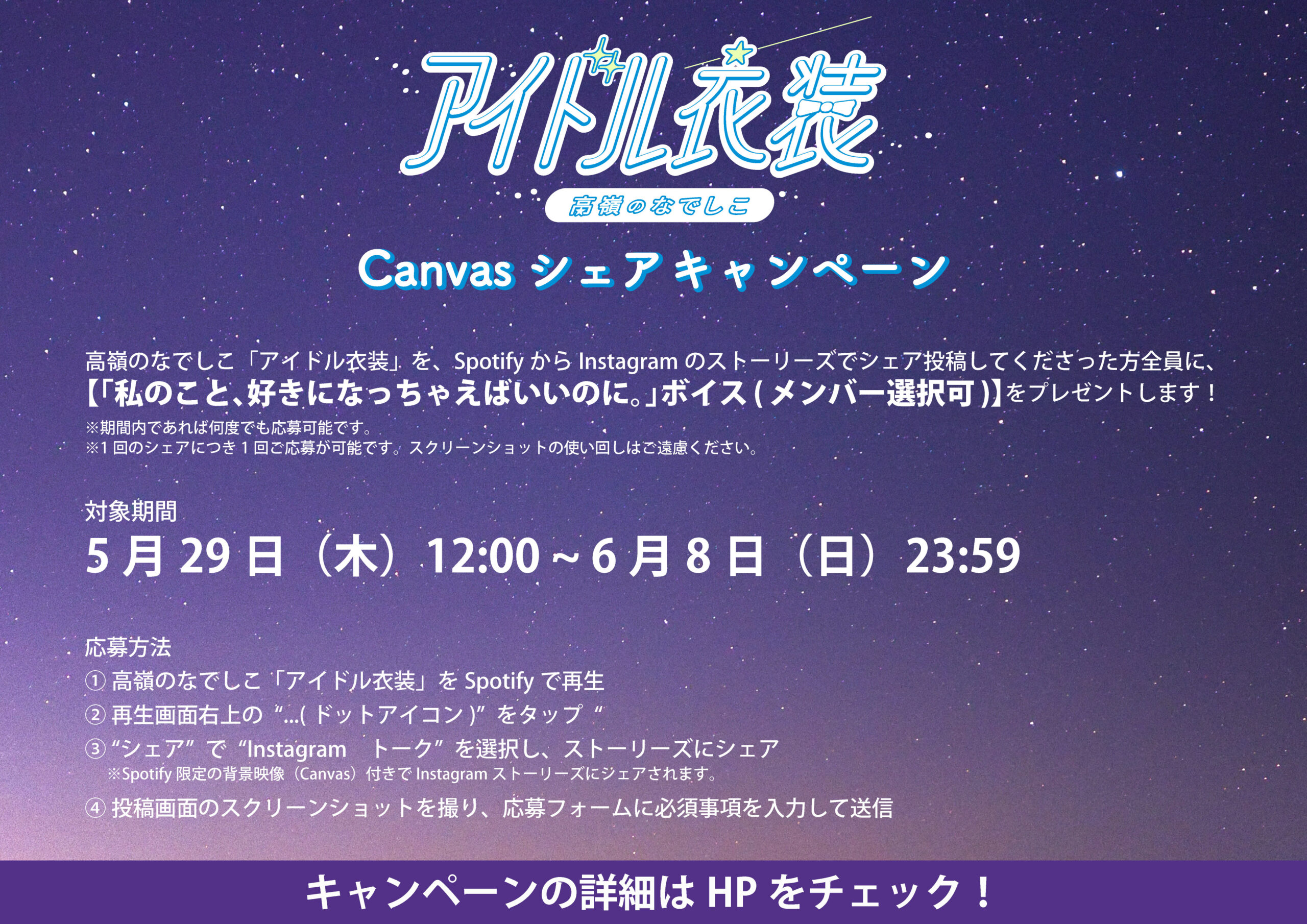 高嶺のなでしこ「アイドル衣装」を、SpotifyからInstagramのストーリーズでシェア投稿してくださった方全員に、【「私のこと、好きになっちゃえばいいのに。」ボイス(メンバー選択可)】をプレゼントします!
